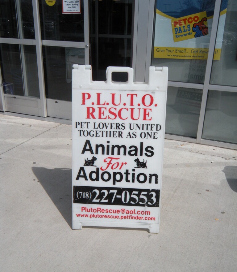 During the week the cats available for adoption can be seen by appointment at our Sharrots Road Catroom, 654A Sharrotts Road, Staten Island, NY 10309. Please call Pat at 347-210-1725. For inquiries on dogs please e-mail plutorescue@aol.com