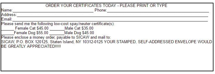 **Cost of certificate includes surgery and anesthesia. Vaccinations and/or medications are NOT included. Some vets also charge for office visits. There is an additional charge for dogs over 50lbs, for pregnant animals, for animals in heat, and for animals with medical complications. Certificates are good for sixty (60) days. They are non-refundable. It takes 2 weeks to get certificate. **Certificate should not be sent for until animal is 4 months old.